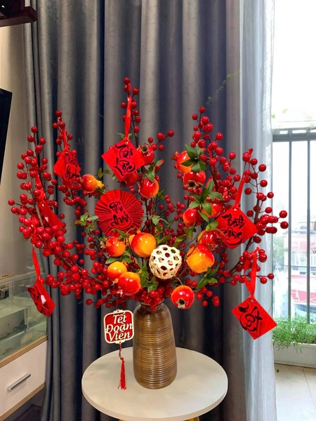 Với vẻ đẹp nhẹ nhàng mà nổi bật, Bình hoa đào đông lựu đỏ đoàn viên trang trí tết góp phần tạo điểm nhấn trang trí tinh tế, giúp không gian thêm ấm cúng và tràn đầy không khí xuân.