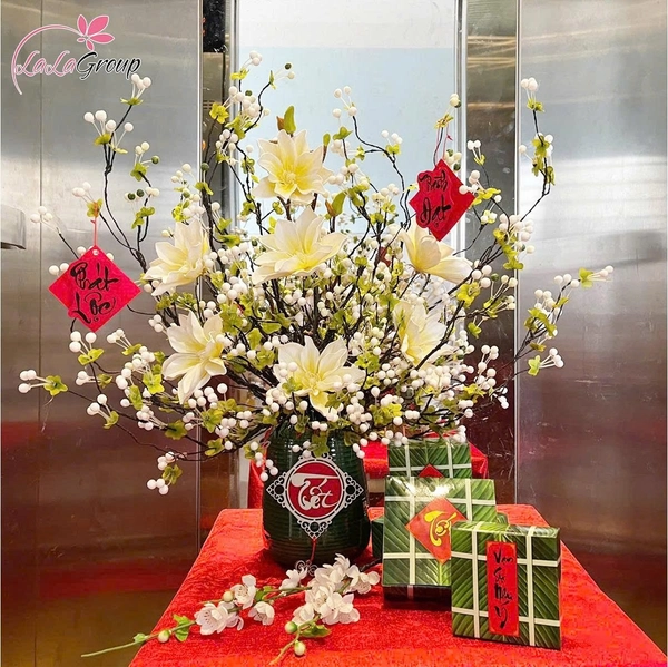Bình gồm: 5 cành hoa bi trắng, 2 cành mộc lan kép và 1 lộc treo chữ tết
