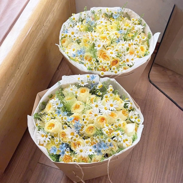 Hoa hồng vàng được chọn từ những bông có cánh đều, màu sắc tươi sáng, trong khi cúc họa mi giúp tạo cảm giác mềm mại và bay bổng. Khi kết hợp, hai loại hoa tạo nên hiệu ứng nhiều lớp, giúp bó hoa trông sinh động nhưng vẫn giữ được sự gọn gàng.