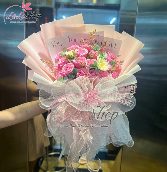 Bó hoa gồm: 20 hoa hồng sáp thơm 4 lớp cánh tim, 2 hoa cúc trắng.