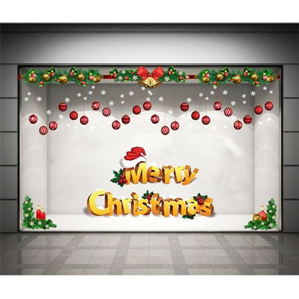 Combo gồm 3 tấm size 60x90cm (Decal dây treo quả cầu Noel đỏ 2, Decal dây thông Noel và chuông vàng 4, Decal Merry Christmas và nón Noel 2)