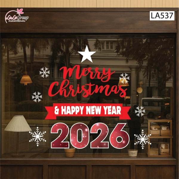 Decal trang trí Noel Merry christmas & Happy new year 2026 chữ đỏ xuất khẩu , in bằng công nghệ cao, không viền trắng không bay màu theo thời gian, dán lên như vẽ. Đặc biệt không gây bẩn kính, lau nước thoải mái, có thể bóc ra và dán lại