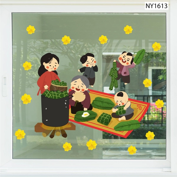 Decal Trang Trí Tết gia đình sum vầy gói bánh ngày Tết xuất khẩu , in bằng công nghệ cao, không viền trắng không bay màu theo thời gian, dán lên như vẽ. Đặc biệt không gây bẩn tường, lau nước thoải mái.