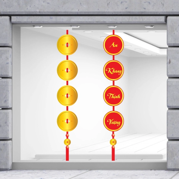Decal Trang Trí Tết Đồng Tiền Vàng Và Câu Đối An Khang Thịnh Vượng tạo nên một không gian 'Tết Việt' của bạn trong dịp Tết nguyên đán, để cùng chào đón năm mới trong tâm trạng phấn khởi, và báo hiệu một năm mới đến thật nhiều may mắn...!!!