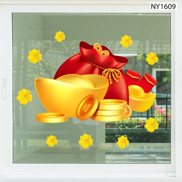 Decal Trang Trí Tết Túi Tiền Và Thỏi Vàng xuất khẩu , in bằng công nghệ cao, không viền trắng không bay màu theo thời gian, dán lên như vẽ. Đặc biệt không gây bẩn tường, lau nước thoải mái.