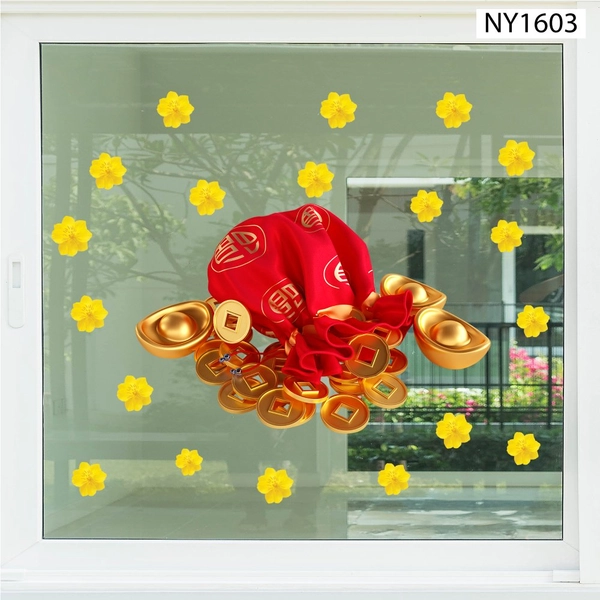 Decal Trang Trí Tết Túi Tiền Vàng Và Hoa Mai xuất khẩu , in bằng công nghệ cao, không viền trắng không bay màu theo thời gian, dán lên như vẽ. Đặc biệt không gây bẩn tường, lau nước thoải mái.