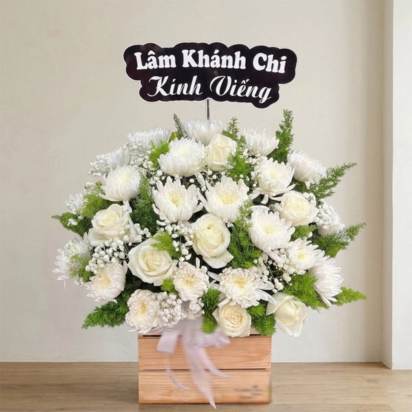 Chậu hoa chia buồn kết hợp hoa hồng trắng và hoa cúc trắng tạo nên tổng thể nhẹ nhàng và trang nhã. Thiết kế dạng chậu thấp phù hợp đặt trên bàn hoặc các khu vực tưởng niệm nhỏ gọn trong không gian tang lễ.