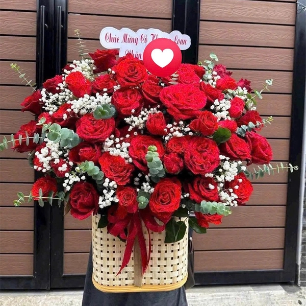 Mẫu giỏ hoa hồng đỏ rực rỡ mang đến cảm giác nổi bật và ấm áp, phù hợp sử dụng trong nhiều dịp tặng khác nhau.