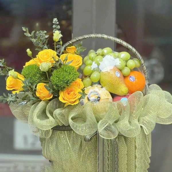 Giỏ quà trái cây kèm hoa tươi được thiết kế với bố cục cân đối giữa các loại trái cây nhập khẩu và hoa hồng vàng nổi bật. Sự kết hợp này tạo nên tổng thể vừa sinh động vừa trang nhã, phù hợp với các dịp chúc mừng và gặp gỡ trang trọng.