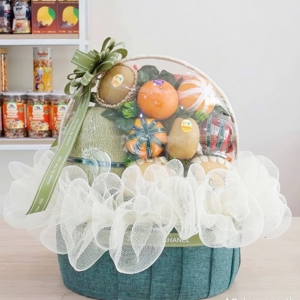 Giỏ Quà Tặng Trái Cây Nhập Khẩu Màu Xanh Phối Lưới Trắng