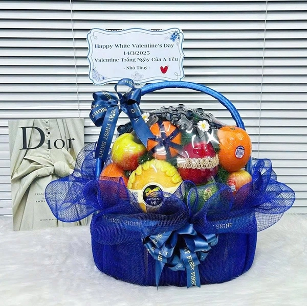 Giỏ trái cây nhập khẩu gắn lưới tone xanh dương được thiết kế theo phong cách hiện đại, mang lại cảm giác tươi mát và dễ chịu. Sự kết hợp giữa trái cây và lớp lưới trang trí giúp tổng thể trở nên gọn gàng, tinh tế và dễ tạo thiện cảm