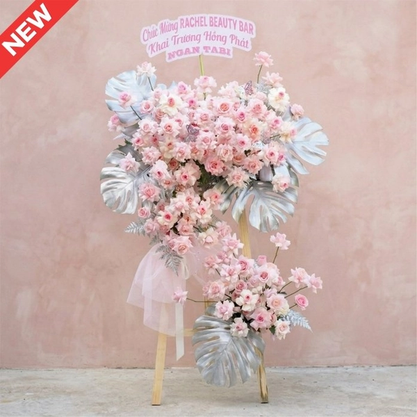 Kệ hoa mừng khai trương tone hồng 2 tầng mang phong cách nhẹ nhàng và trang nhã, phù hợp cho những không gian cần sự tinh tế nhưng vẫn giữ được không khí chúc mừng. Thiết kế hai tầng giúp kệ hoa trông cao ráo, cân đối và nổi bật hơn khi đặt tại khu vực lễ.