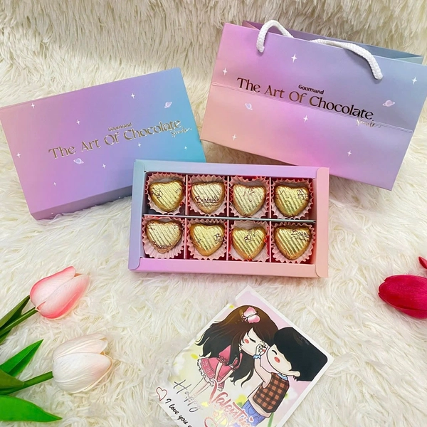 Hộp quà socola Valentine được thiết kế xinh xắn với vỏ hộp hình tim được thắt nơ điệu đà với những màu sắc tinh tế và vô cùng bắt mắt.