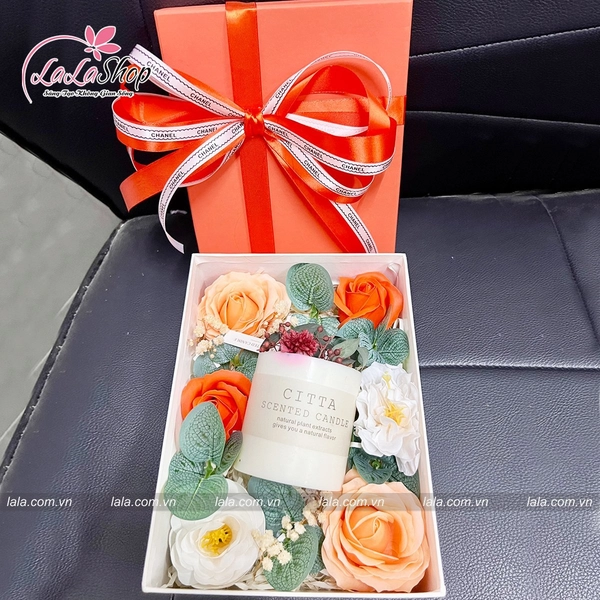 Hộp quà tặng nến thơm hoa sáp kèm phụ kiện mẫu chữ nhật 079