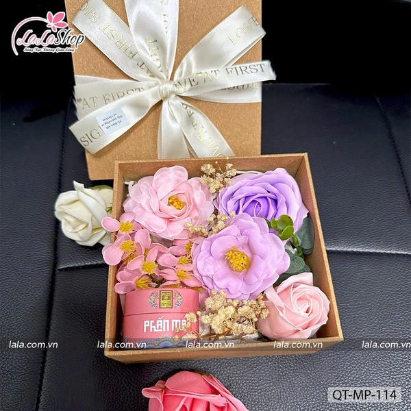 Hộp quà tặng phấn má hồng cao cấp mẫu 114 là hộp quà được trang trí bằng hoa sáp có kèm mỹ phẩm, sản phẩm được nhiều người lựa chọn để tặng cho phái đẹp trong những ngày kỷ niệm đáng nhớ 8-3, 20-10, 20-11.