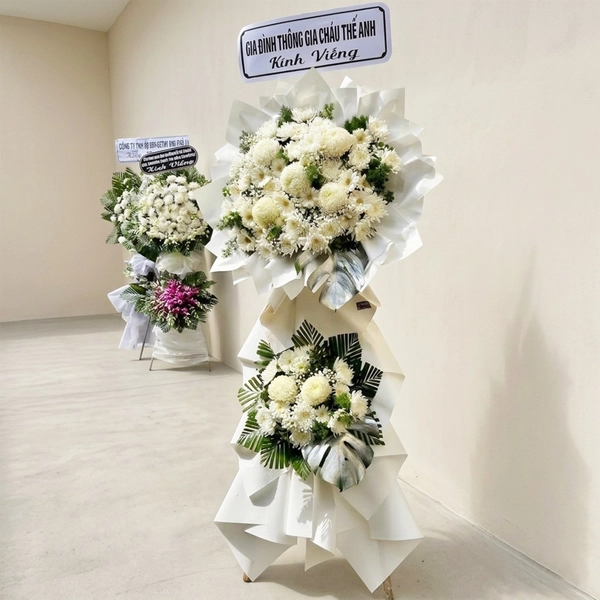 Kệ hoa chia buồn hai tầng sử dụng hoa cúc trắng làm chủ đạo, kết hợp cùng lá xanh được sắp xếp gọn gàng tạo nên tổng thể hài hòa và trang nghiêm. Sản phẩm phù hợp để sử dụng trong các buổi lễ viếng hoặc tang lễ, mang lại cảm giác nhẹ nhàng và tôn trọng không gian tưởng niệm.