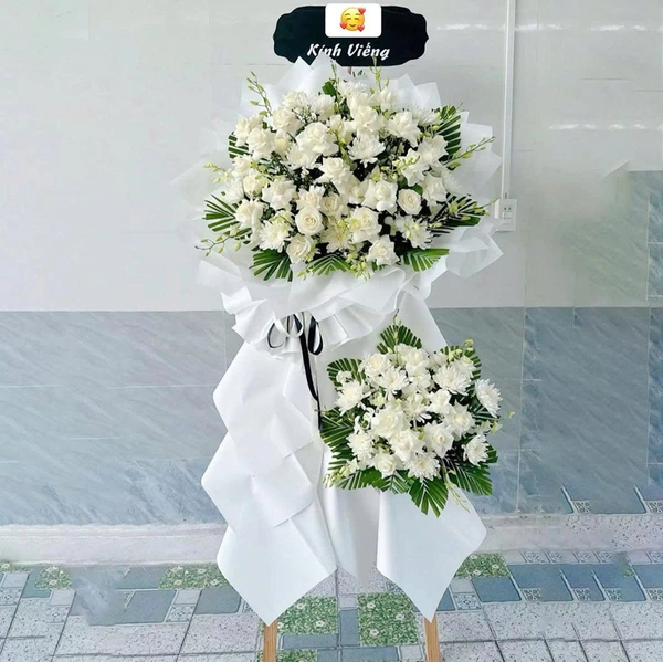 Kệ hoa chia buồn hai tầng sử dụng hoa hồng trắng làm điểm nhấn chính, kết hợp cùng lớp lưới trang trí được tạo hình mềm mại, mang đến tổng thể thanh nhã và trang nghiêm. Thiết kế phù hợp để gửi lời chia sẻ trong các buổi lễ viếng hoặc tang lễ cần sự tinh tế và gọn gàng.