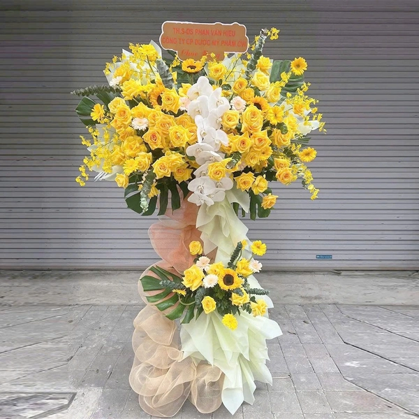 Màu vàng trong kệ hoa thường được xem là biểu tượng của sự ấm áp và thịnh vượng. Khi kết hợp trong thiết kế khai trương, sắc vàng giúp tổng thể trở nên tươi sáng và nổi bật, đồng thời tạo cảm giác trang trọng cho khu vực trưng bày.