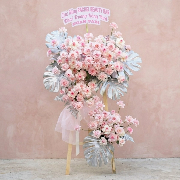 Kệ hoa mừng khai trương tone hồng 2 tầng mang phong cách nhẹ nhàng và trang nhã, phù hợp cho những không gian cần sự tinh tế nhưng vẫn giữ được không khí chúc mừng. Thiết kế hai tầng giúp kệ hoa trông cao ráo, cân đối và nổi bật hơn khi đặt tại khu vực lễ.