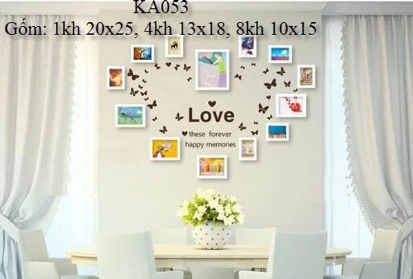 Bộ khung ảnh kèm KA053 gồm khung ảnh treo tường bằng gỗ cao cấp và decal dán tường chữ LOVE kết hợp lại với nhau vừa làm mới cho không gian vừa tạo sự thu hút vào những khung ảnh của bạn