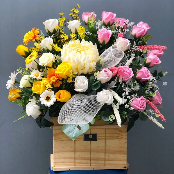 Lẵng hoa sáp thơm để bàn nụ hồng chen sắc vàng