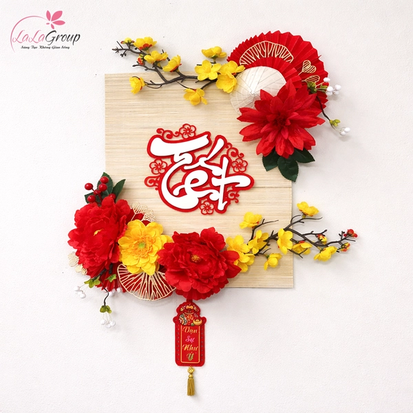 Mành tre trang trí Tết kèm mai vàng khoe sắc tạo điểm nhấn nổi bật với sự kết hợp hài hòa giữa chất tre mộc mạc và sắc mai vàng tươi sáng. Bố cục trang trí cân đối, màu sắc rực rỡ vừa đủ giúp không gian ngày Tết trở nên sinh động mà vẫn giữ được nét tinh tế.