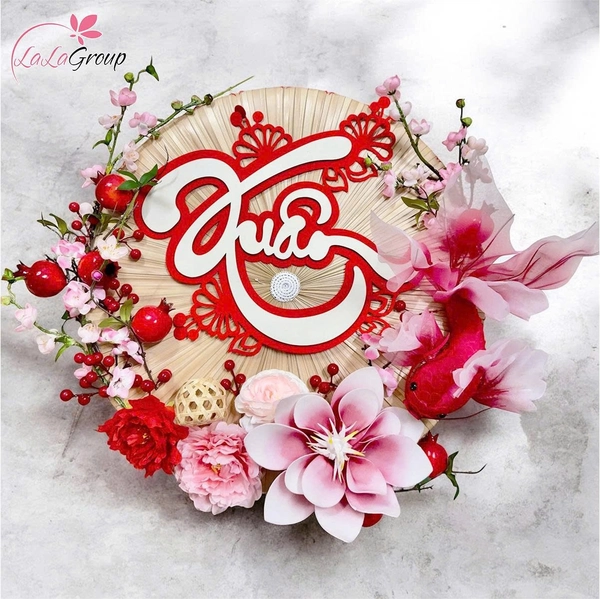 Mẹt nón quai thao 60cm chữ Xuân kèm hoa đào hồng gây ấn tượng với kiểu dáng nón truyền thống kết hợp cùng bố cục trang trí mềm mại, tạo nên vẻ đẹp vừa hoài niệm vừa tinh tế. Chữ Xuân được đặt nổi bật ở trung tâm, kết hợp sắc đào hồng dịu nhẹ giúp tổng thể hài hòa, mang không khí Tết rõ nét nhưng không quá rực rỡ.