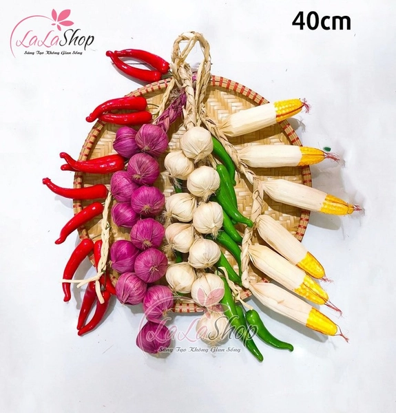 Mỗi bộ gồm: Mẹt, ớt xanh, ớt đỏ, dây tỏi treo, dây hành tím, dây bắp ngô.