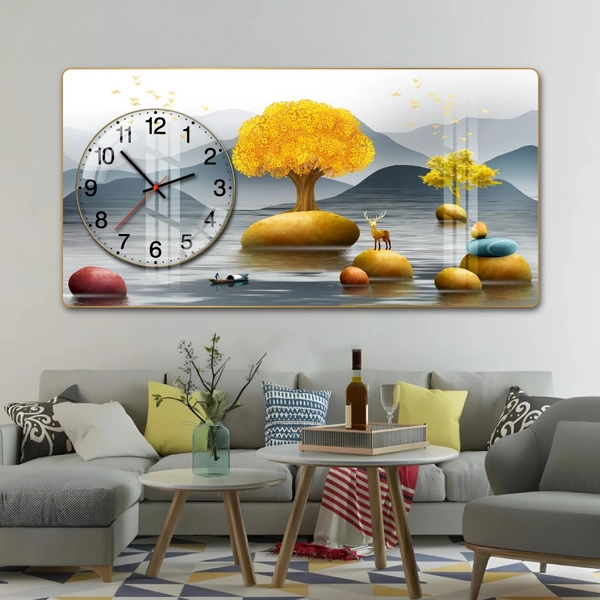 Tranh Đồng Hồ Nổi 3D "Cây Kim Tiền Và Hươu Vàng Phú Quý" là sự kết hợp tinh tế giữa hình ảnh cây kim tiền mạ vàng rực rỡ, biểu tượng của sự phát đạt và thịnh vượng, cùng chú hươu vàng tinh xảo, tượng trưng cho sự giàu có, may mắn và bền vững. Bức tranh không chỉ làm tôn lên vẻ đẹp sang trọng mà còn mang ý nghĩa phong thủy, giúp gia chủ thu hút tài lộc, vận may và sự thịnh vượng.