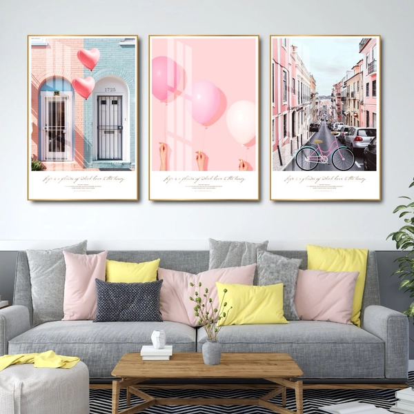 Tranh treo tường Bóng Bay Tình Yêu là sự kết hợp hoàn hảo giữa tông màu hồng ngọt ngào và những hình ảnh thơ mộng của đường phố Châu Âu, tượng trưng cho tình yêu với sự đầy cảm xúc và lãng mạn.