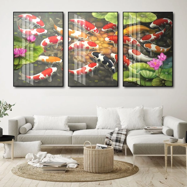 “Tranh Treo Tường Cá Chép Bên Ao Sen” là tác phẩm nghệ thuật mang đậm ý nghĩa phong thủy, biểu trưng cho sự kiên trì, may mắn và thịnh vượng. Hình ảnh cá chép bơi lội bên ao sen tạo nên cảm giác thanh bình, tĩnh lặng, mang đến không gian sống gần gũi với thiên nhiên.Bức tranh không những trang trí không gian mà còn là mang lại cảm giác thư thái, xoa dễ chịu bạn mỗi khi ngắm nhìn.