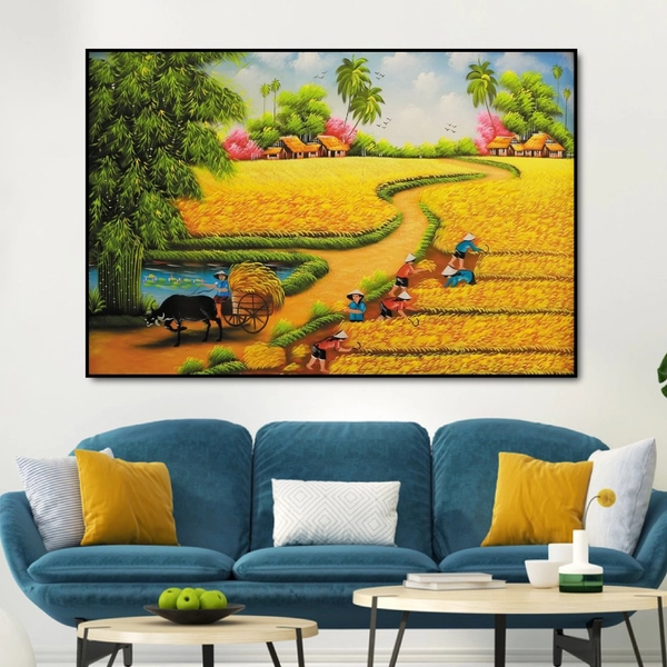 Bức tranh treo tường cảnh ruộng lúa tái hiện khung cảnh bình dị của đồng quê, với những mảng lúa vàng rực rỡ trong ngày gặt hái. Đây không chỉ là một tác phẩm nghệ thuật mà còn là biểu tượng của sự hài hòa và sự nô nức của người nông dân trong công việc sản xuất.