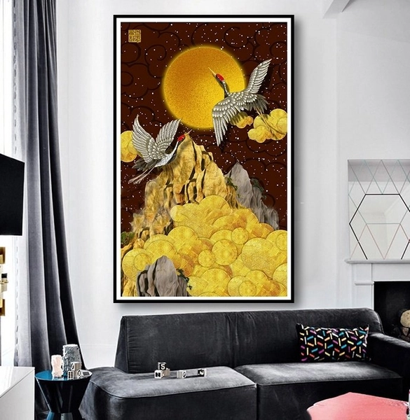 Tranh treo tường hạc trắng trên trời đêm dát vàng là sự kết hợp hài hòa một cách bùng nổ của màu sắc trong bức tranh tạo cảm giác tràn trề năng lượng và khiến cho bạn cảm thấy luôn phấn khích tạo cho không gian ngôi nhà của bạn trong dịp tết nguyên đán luôn tràn đầy sức sống.