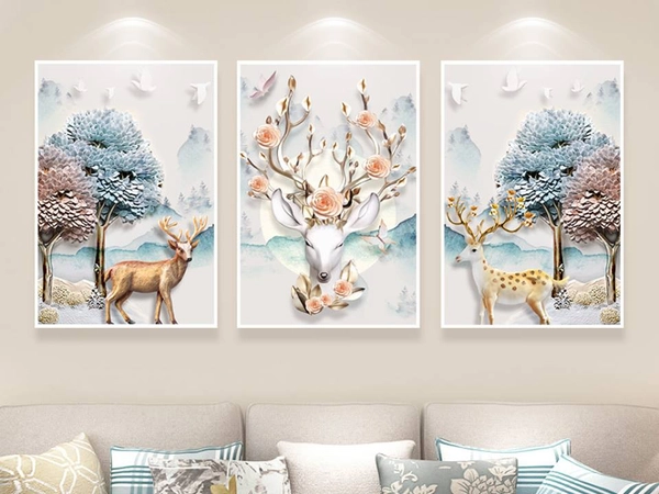Sử dụng màu sắc tinh tế và phong cách nghệ thuật đương đại, tranh hươu kết hợp với các yếu tố thiên nhiên mang đến sự hài hòa, thu hút mọi ánh nhìn.