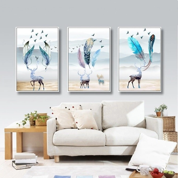 Sử dụng gam màu tự nhiên của hình ảnh hươu và sắc nhẹ nhàng của lông vũ, phù hợp với nhiều phong cách trang trí từ hiện đại đến cổ điển.