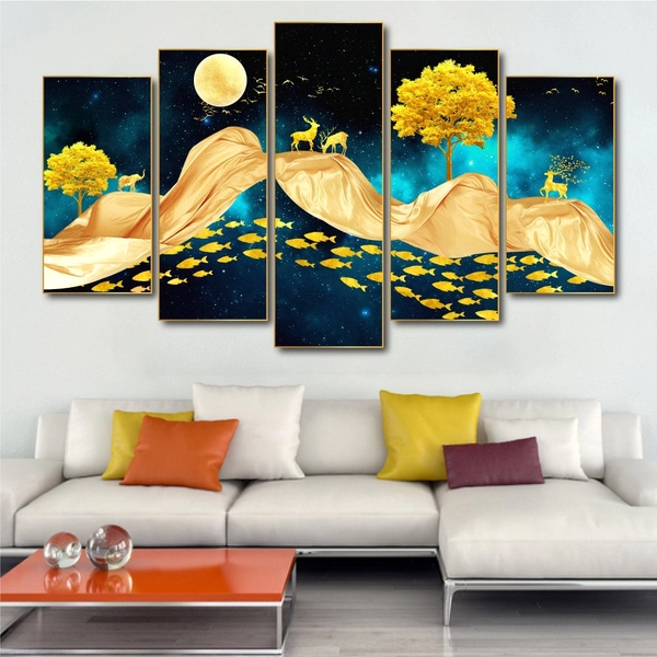 Tranh treo tường nai vàng và đàn cá nghệ thuật là hình ảnh đem lại sự may mắn cho gia chủ giúp không gian trở nên mới lạ ấn tượng. Thích hợp trang trí nhà, quà tặng người thân, đối tác, đồng nghiệp nhân khai trương, tân gia, các dịp lễ,...