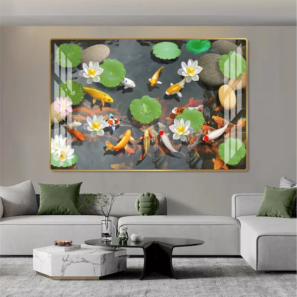 Tranh Treo Tường Nghệ Thuật Cửu Ngư Quần Hội Tranh Phong Thuỷ Phòng Khách – một tác phẩm phong thủy tuyệt đẹp, biểu trưng cho sự thịnh vượng và tài lộc. Hình ảnh chín con cá chép đang bơi lội trong dòng nước tượng trưng cho sự phát đạt, sức khỏe và hạnh phúc. Bức tranh không những trang trí không gian mà còn là mang lại cảm giác thư thái, xoa dễ chịu bạn mỗi khi ngắm nhìn.