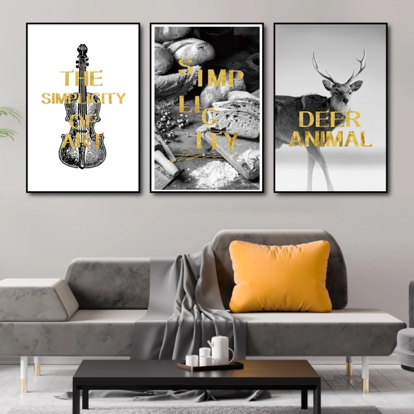 Tranh treo tường phong cách trắng đen hươu và đàn violin nghệ thuật mang phong cách nghệ thuật tối giản, sử dụng tông màu trắng đen chủ đạo kết hợp với những chi tiết màu vàng tạo điểm nhấn. Hình ảnh cây đàn violin, nai, và các mẫu bánh mì được thể hiện một cách tinh tế và nghệ thuật, mang lại sự thanh lịch và sang trọng cho không gian sống.