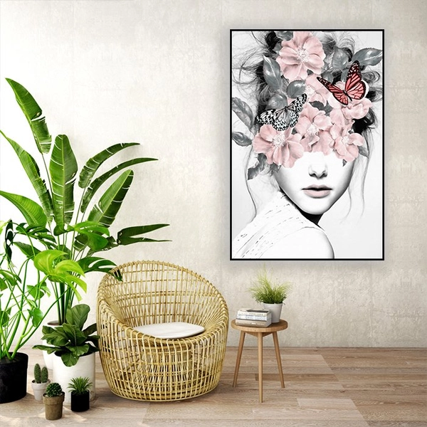 Khám phá vẻ đẹp nghệ thuật tinh tế với Tranh Treo Tường Nghệ Thuật Thiếu Nữ và Hoa. Bức tranh này giới thiệu hình ảnh một cô gái duyên dáng với mái tóc được trang trí bằng những đóa hoa rực rỡ và những chú bướm trắng đen bay lượn xung quanh. Với phong cách nghệ thuật đầy lôi cuốn và màu sắc hòa quyện tinh tế, bức tranh không chỉ làm nổi bật vẻ đẹp nữ tính mà còn tạo ra một không gian nghệ thuật thanh thoát và quyến rũ cho bất kỳ phòng nào.