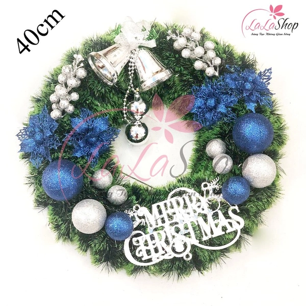 Mỗi bộ gồm: Vòng nguyệt quế, chuông đôi, quả châu, quả berry, hoa trạng nguyên, bảng treo merry christmas.